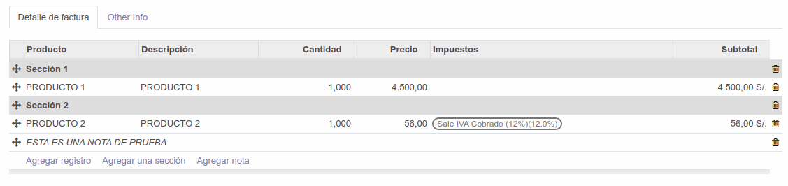 Permite dividir el listado de líneas de facturas en secciones y adicionar notas a las líneas.