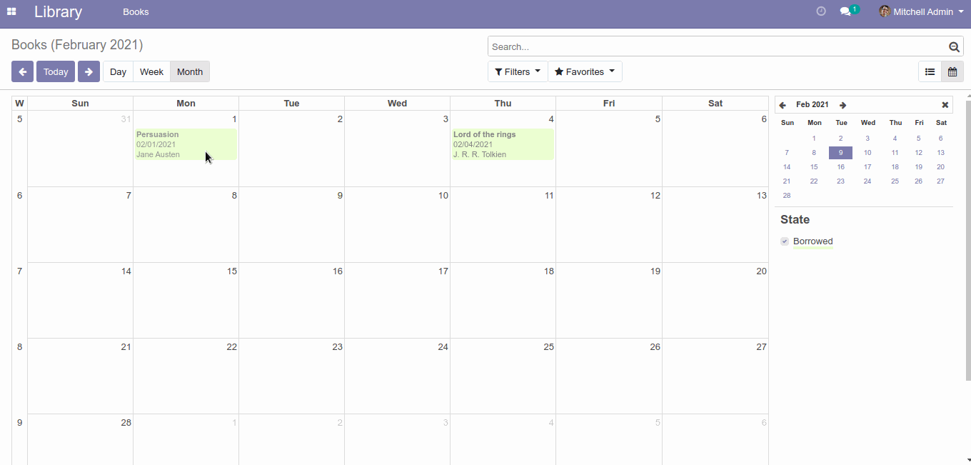 <calendar string="Books" date_start="publish_date" color="state" quick_add="False" mode="month"
