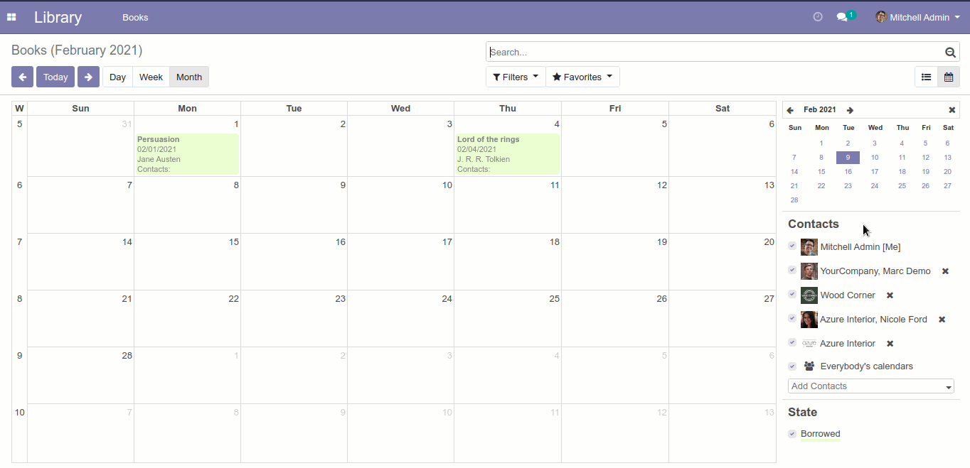 La vista calendario muestra los registros como eventos en un calendario diario, semanal, mensual (y a partir de Odoo 14 también se incluye el calendario anual).